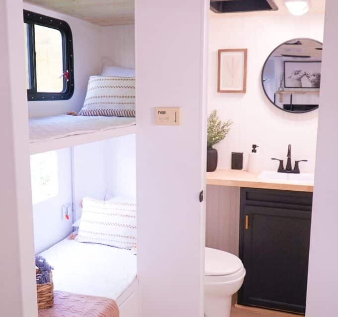 This travel trailer was completely renovated on June 2022 and since then has only been used as a home office. It comes fully furnished such as a flat screen TV and an electric, color changing fireplace that has a remote. Over the last 6 months it has not been taken out on the road and has plenty of undercarriage storage under the beds and under the kitchen benches. The RV has one large slide out and the kitchen table folds down to create a sleeping area. New overhead speakers were also installed which attaches to a stereo system to play music/radio throughout the RV. Sleeps six including the bunk beds, the queen bed and kitchen area (and also couch if needed). Beautiful, unique glamping style!